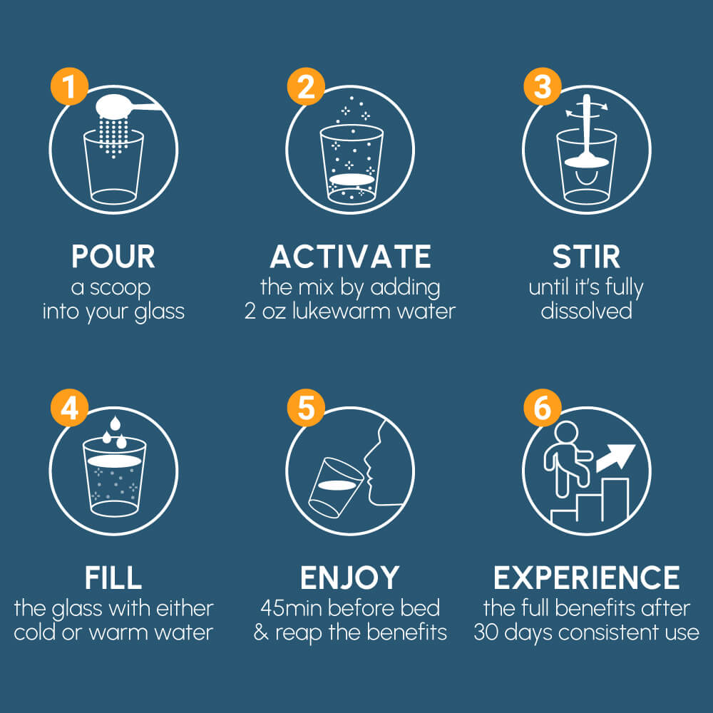 Just mix 1 scoop with water 45 minutes before bed. For best results, stir with 2 oz lukewarm water first to activate, then top off with cold or warm water.